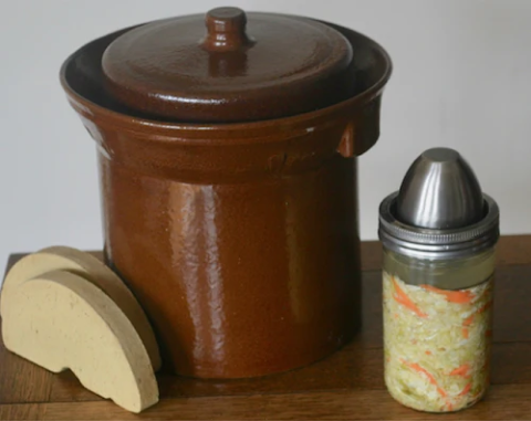 This spring loaded device keeps vegetables submerged under the brine, so no mold occurs. It works very well for me and I do recommend it.